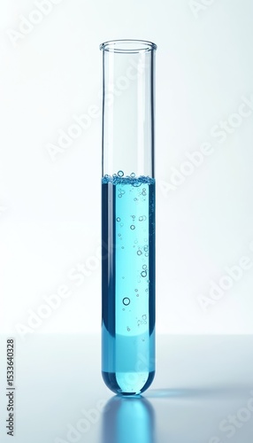 Illustration shows test tube filled with clear blue liquid. Bubbles in liquid suggest mixing. Scientific concept. Suitable for medical, beauty, cosmetic, skincare product presentation. Science,