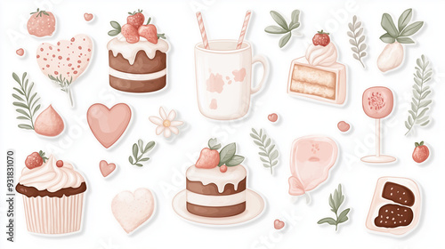 illustration stickers for wedding and party, light fresh color, cute items like cakes and crowns, keep long distance between elements, white background, clean background,