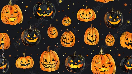 Illustrations of Halloween pumpkins in various artistic styles. AI generated image. Doodle Pattern Background