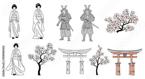 Illustrations of japanese women in kimonos samurai warriors cherry blossom trees and torii gates design elements