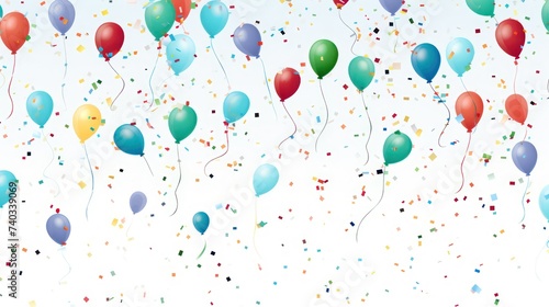 Illustrative sketch of flying colorful balloons, with a clean white background and colorful splotched motifs.