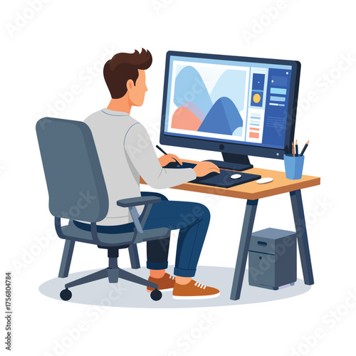Illustrator at Desk Using Pen Tablet and Computer for Digital Art Creation