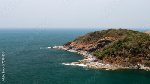 Image of a landscape in Phuket, Thailand near Promthep Cape, a beautiful seaside rock formation and blue waters.