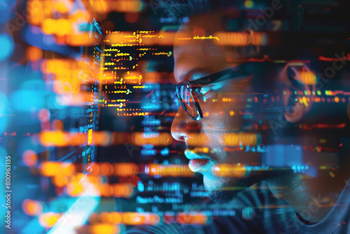 Image of a software developer working on a computer, represented by a double exposure of lines of code and a developer in action, with empty copy space
