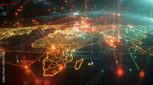 Image of an advanced logistics network seen through a holographic world map, tracking global shipping routes and logistics hubs.