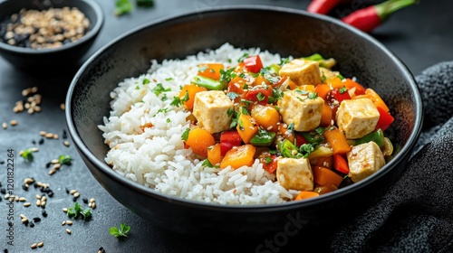 Image of rice and Chinese stir-fry with vegetables and tofu in a black bowl, emphasizing colorful and savory aspects. Ideal for Chinese cuisine and quick meals.
