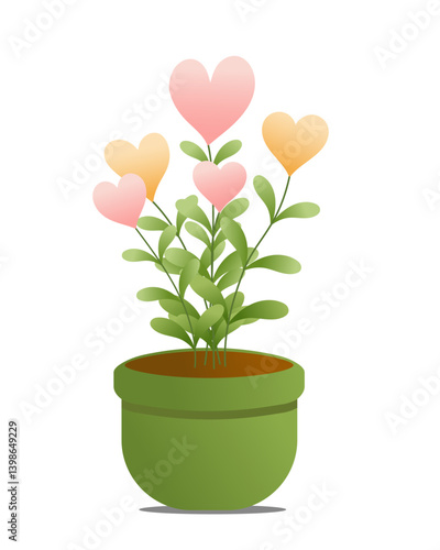 Image shows a pot with a plant with green leaves and heart shaped flowers in shades of pink and yellow. The pot is green and round in shape. The plant is isolated on a white background. Vector illustr