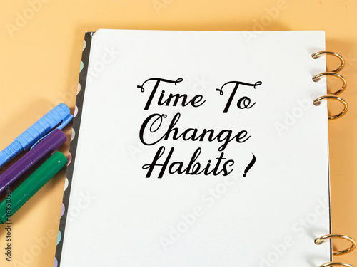 images of pen note book with time to change habits wording on a nude background