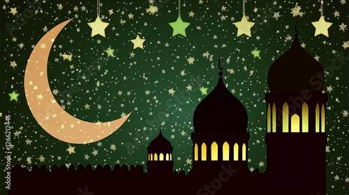 immersive starry night mosque scene under crescent moon perfect for ramadan eid backgrounds and islamic festive designs with colorful islamic architecture at night