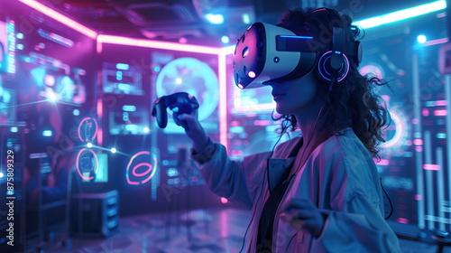 Immersive Virtual Reality Gaming: Futuristic High-Tech Experience with VR Headset and Controllers.