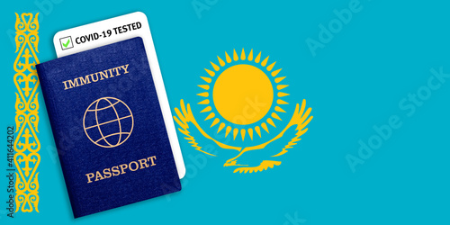 Immunity passport and test result for COVID-19 on flag of Kazakhstan