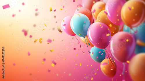 Impressive Colorful holiday background with balloons and confetti. Shallow Doff