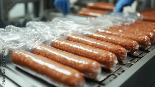 In a bustling sausage production factory, workers are engaged in the process of preparing and packaging sausages for distribution. The bright workspace is filled with activity