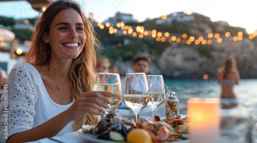 In a charming seaside setting, a woman enjoys seafood paired with wine, highlighting the blend of elegance and joy, with lights forming a picturesque backdrop.