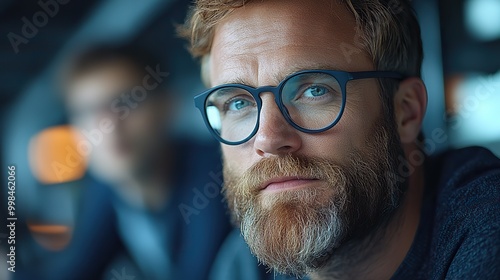 In a data center, a bearded IT technician and a young engineer discuss diagnostics and maintenance tasks next to server racks, highlighting teamwork and technical expertise.
