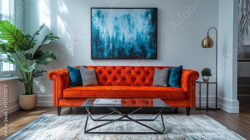 In a stylish living room, an eye-catching orange velvet couch features plush pillows and is complemented by a glass coffee table and abstract artwork, creating a cozy yet chic atmosphere