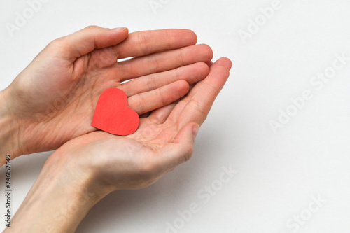 In men's hands lies a small red heart on a gray background. A fragment of a man's hands.