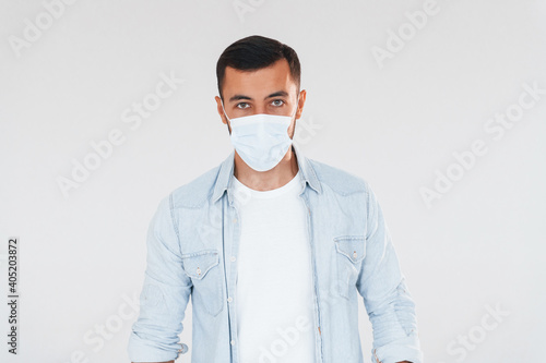 In protective mask. Young handsome man standing indoors against white background