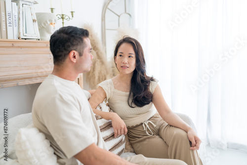 In Selangor, Malaysia, a couple consisting of a Chinese Malaysian woman in her twenties and an Indian Malaysian man in his thirties are relaxing and talking in room with Asian-inspired furniture.