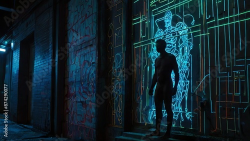 In the dimly lit alley, a towering bioluminescent figure emerges from the shadows, casting an eerie neon glow on the gritty copy space