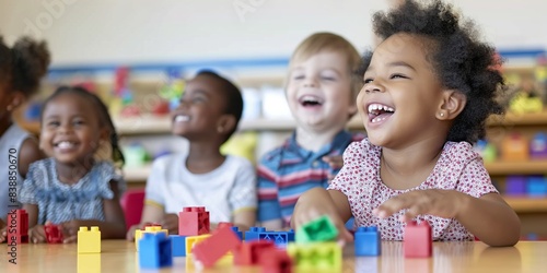 In the kindergarten classroom, children enjoy learning and playing together with colorful toys and friends.