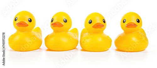 In the picture, a row of three yellow rubber duck toys are sitting next to each other. They are bright yellow in color and placed closely in a line on a white background.