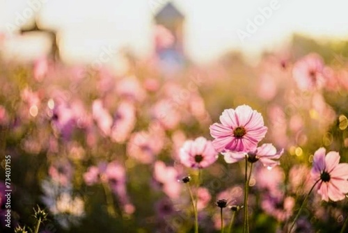 In the picture is a field of bright pink flowers in the atmosphere.The morning was a field of pink flowers, very beautiful and refreshing.