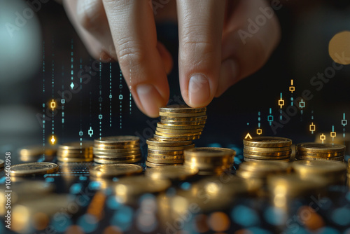 Increasing Coin Stacks with Glowing Financial Graph and lights.