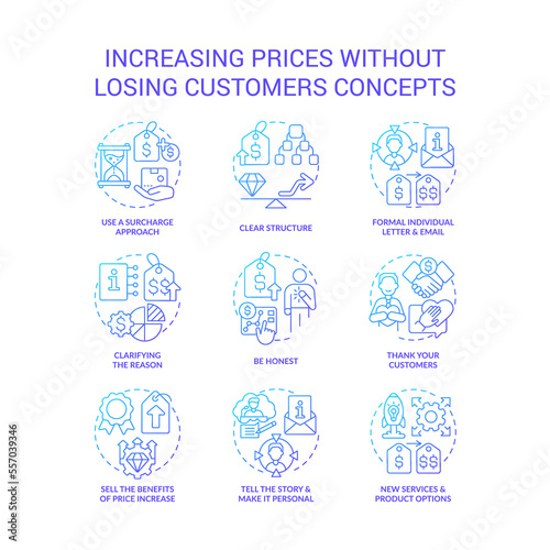 Increasing prices without losing customers blue gradient concept icons set. Commercial strategy idea thin line color illustrations. Isolated symbols. Roboto-Medium, Myriad Pro-Bold fonts used