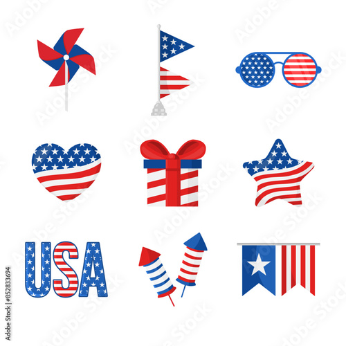 Independence Day America celebration in USA icons set design element flat style Collection objects for July 4th national holiday Vector illustration.