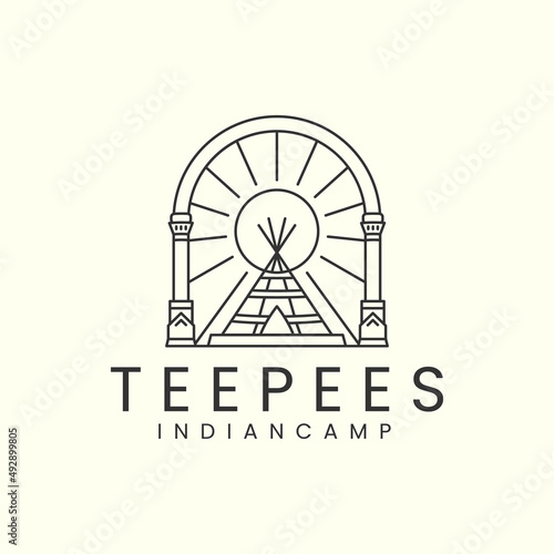 indian camp or teepees with badge and line art style logo icon template design.native, america,traditional, vector illustration
