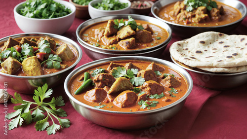 Indian curry with naan bread and assorted spices, garnished with cilantro.
