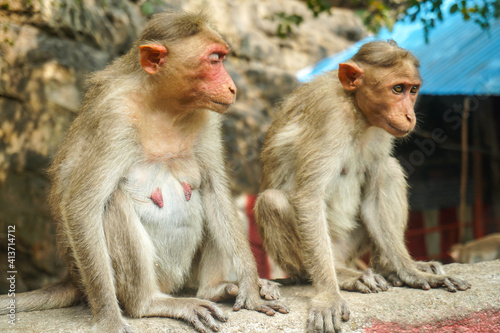 Indian macaque sitting on cement block