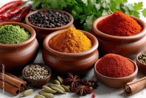 indian spices in terracotta pots, arranged on a white background. the colors and textures add depth to the composition