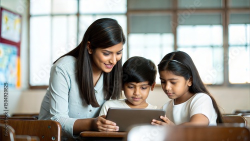 Indian Teacher and Kids Interacting with Educational Tablet in School