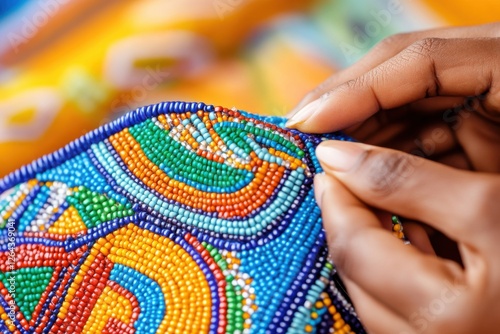 Indigenous artisan meticulously weaving vibrant beadwork, showcasing the artistry and deep cultural significance of traditional craftsmanship in a colorful setting