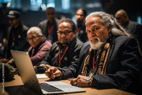 Indigenous language advocates gathering at a conference to discuss preservation strategies. Generative Ai.
