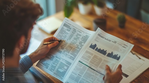 Individual analyzes finance news and investment trends while seated at a wooden table
