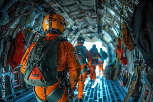 Individuals in orange flight suits walking inside military transport aircraft filled with equipment and gear during operation. The image captures dynamic environment and sense of movement