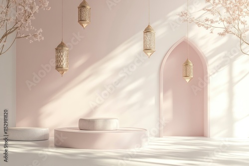 Indonesian bedug and product podium 3d rendering background. Concept of islamic celebration ramadan kareem, marhaban and eid al fitr adha with blank space.