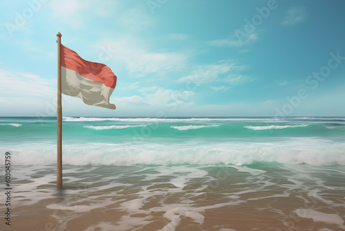 Indonesian flag flapping against a pristine Bali beach. generative AI