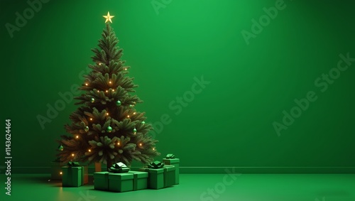 Indoor green Christmas tree on a green empty room with some blinkers and green wrapped gifts under the tree