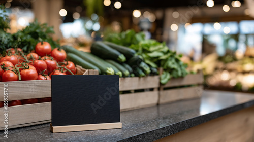 Indoor market ambiance with stacked crates of zucchini, juicy tomatoes, and leafy greens; blank wooden signboard sits prominently on countertop awaiting handwritten chalk promo