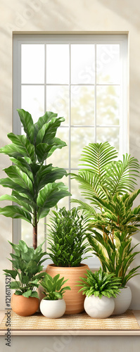 Indoor plants in pots on windowsill, sunlight through window, home decor