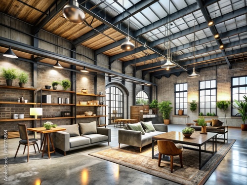 Industrial Chic Warehouse: Exposed beams, metallic accents, flexible storage options, edgy and utilitarian.