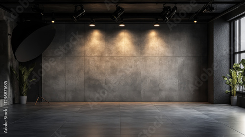 industrial concrete wall studio background with spot lights and tile floor 3d render illustration