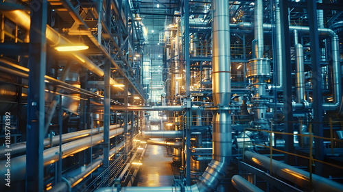 Industrial facility with intricate piping and illuminated structures, showcasing manufacturing processes