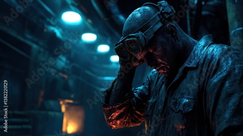 Industrial Fatigue: Exhausted Miner Wipes Sweat in Harsh, Dimly Lit Environment