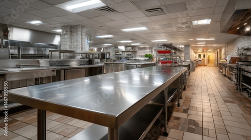 Industrial food preparation space with large stainless table centered for efficient workflow