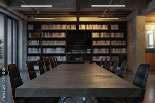 Industrial minimalist conference room with raw concrete table, exposed steel beams, black leather chairs. Symmetrical layout and curated bookshelves for corporate branding or luxury interior design.
